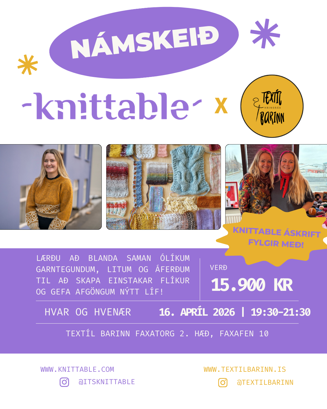 Uppskrift af helgarpeysunni og garn úr nammibar Textíl Barsins fylgir með námskeiðinu.